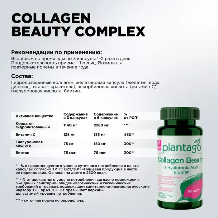 PLANTAGO Коллаген с биотином и гиалуроновой кислотой — это инновационный комплекс для поддержания красоты и здоровья кожи, волос и ногтей. Сочетание коллагена, биотина и гиалуроновой кислоты обеспечивает всестороннюю поддержку вашего организма, помогая сохранить молодость и упругость кожи.