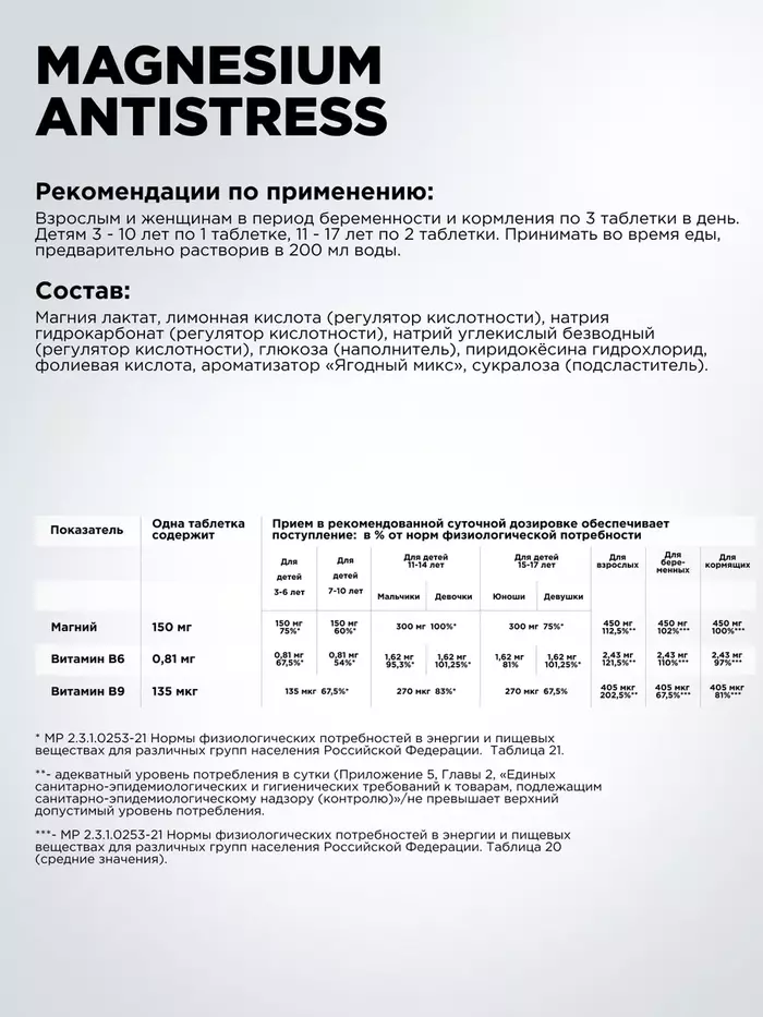 Максимальное содержание Магния 150 мг в суточной дозировке и витамины группы B, усиливающие действие Магния.