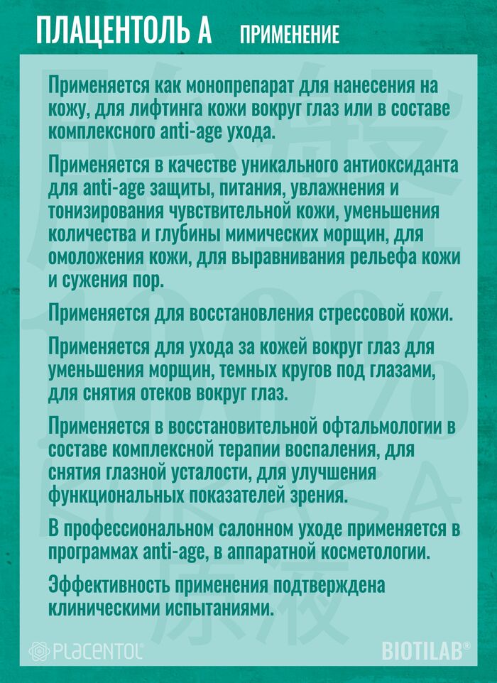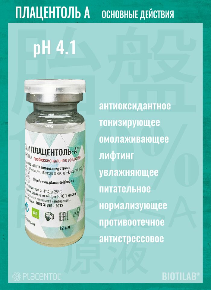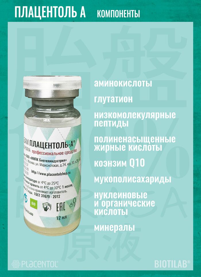 Содержание биологически активный веществ в «Плацентоль А»: аминокислоты, глутатион, низкомолекулярные пептиды, полиненасыщенные жирные кислоты, коэнзим Q10, мукополисахариды, нуклеиновые и органические кислоты, минералы.
