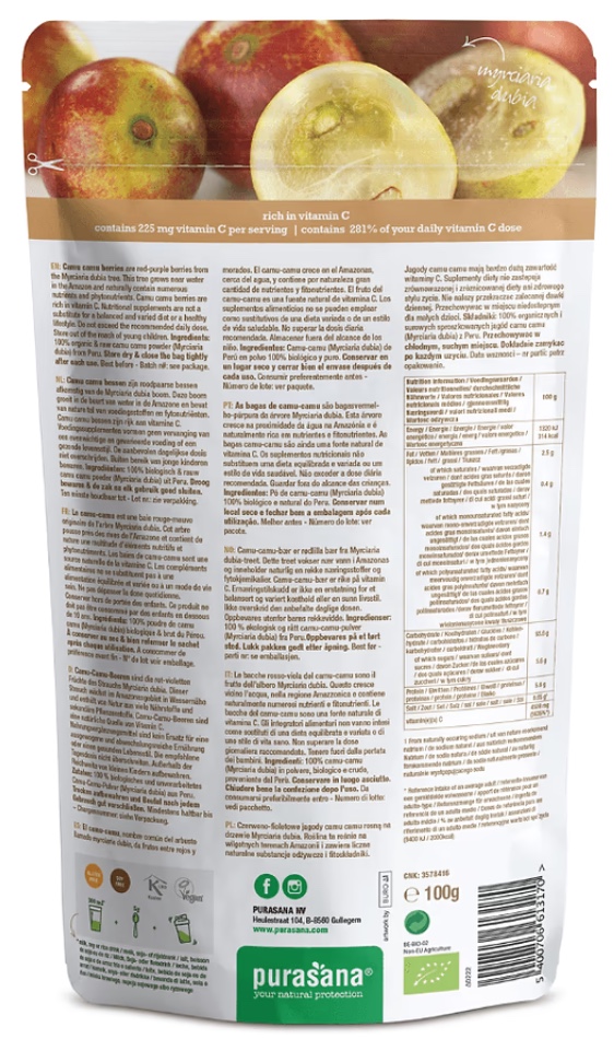 Порошок Каму-Каму Purasana легко добавлять в смузи, йогурты или другие блюда, что делает его удобным для ежедневного использования. Он подходит для веганов и не содержит искусственных добавок.