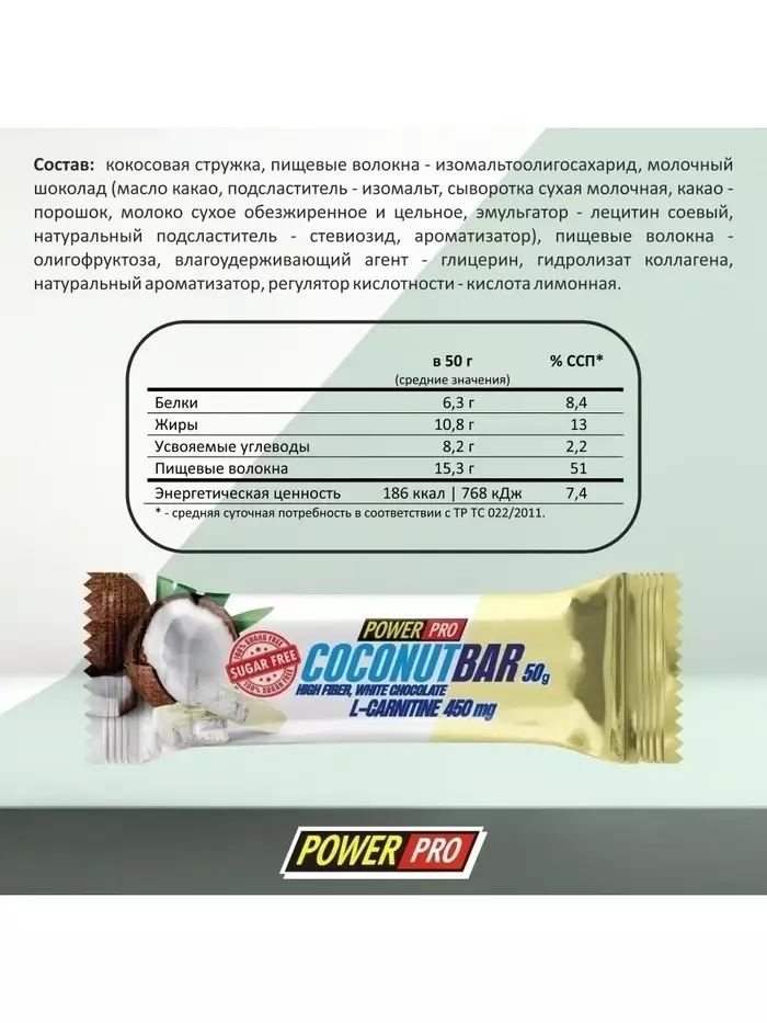 PowerPro Протеиновый батончик Белый шоколад-кокосовая стружка, 50 г, 20 шт в упаковке до 19.01.25