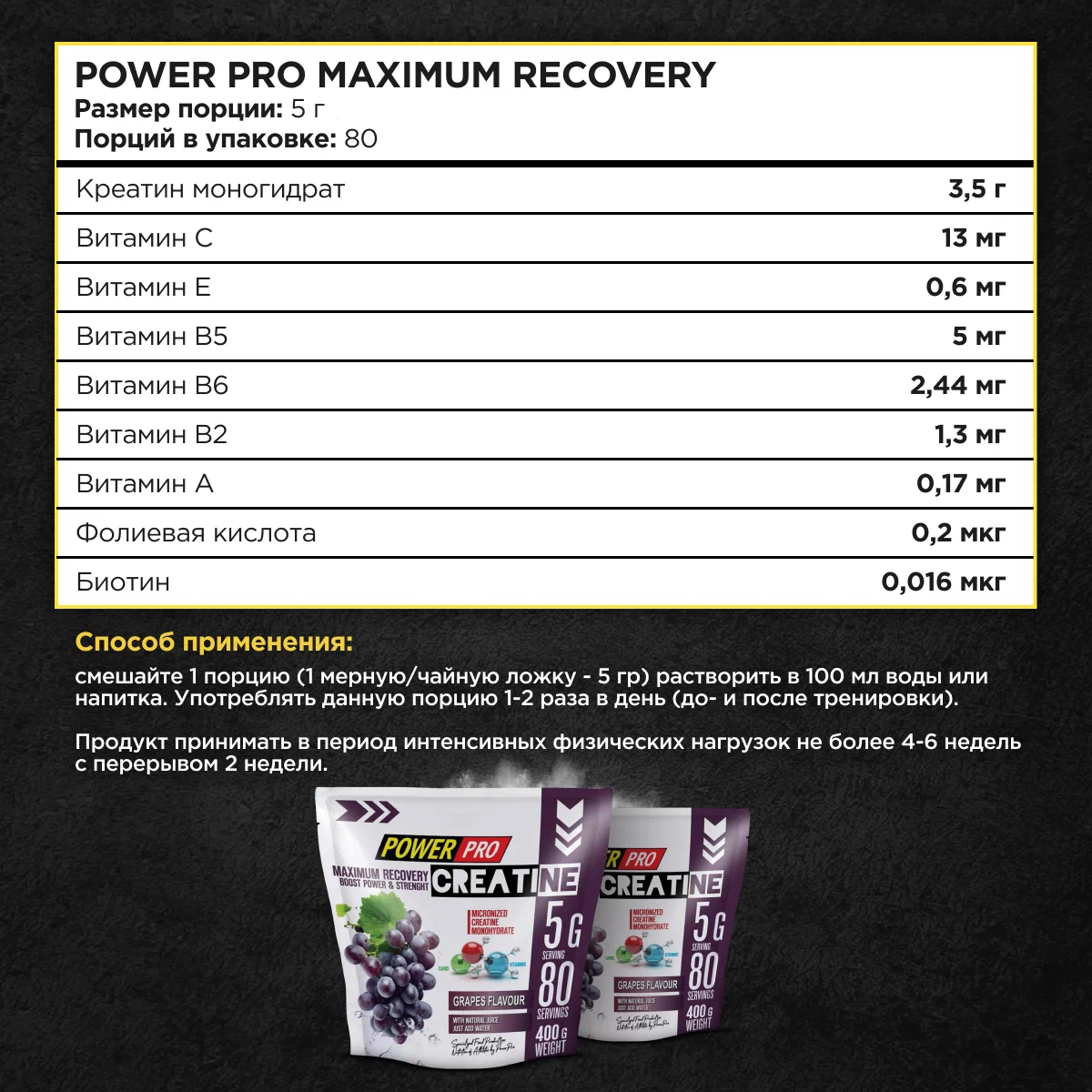 PowerPro Креатин Maximum Recovery Мохито, 400 г — это инновационная добавка, созданная для максимального восстановления и повышения спортивных результатов. Сочетая в себе мощь креатина и освежающий вкус мохито, этот продукт станет незаменимым помощником для всех, кто стремится к новым высотам в фитнесе и бодибилдинге.Преимущества и свойства:Ускоренное восстановление:Креатин способствует быстрому восстановлению мышц после интенсивных тренировок, уменьшая усталость и мышечные боли.Увеличение силы и выносливости:Регулярное употребление продукта помогает повысить физическую производительность, увеличивая силу и выносливость.Поддержка гидратации:Формула с электролитами способствует поддержанию оптимального уровня гидратации, что особенно важно во время интенсивных тренировок.Освежающий вкус:Вкус мохито делает прием добавки приятным и освежающим, что способствует регулярному употреблению.Удобство использования:Порошковая форма легко растворяется в воде, обеспечивая быстрое и удобное приготовление напитка.Особенности:PowerPro Креатин Maximum Recovery отличается высокой чистотой и качеством ингредиентов. Продукт разработан для спортсменов и активных людей, стремящихся к улучшению своих физических показателей. Благодаря уникальной формуле, он подходит как для профессионалов, так и для любителей.Условия хранения:Храните продукт в сухом, прохладном месте, защищенном от прямых солнечных лучей. После вскрытия упаковки рекомендуется плотно закрывать крышку, чтобы избежать попадания влаги и сохранить свежесть продукта.О бренде PowerPro:PowerPro это бренд, предлагающий продукцию для поддержания здоровья и укрепления иммунной системы. С использованием натуральных ингредиентов и строгого контроля качества, PowerPro создает продукты, которые помогают людям поддерживать баланс здоровья и достигать своих жизненных целей. Более 15 лет PowerPro помогает людям по всему миру поддерживать здоровье и активность.