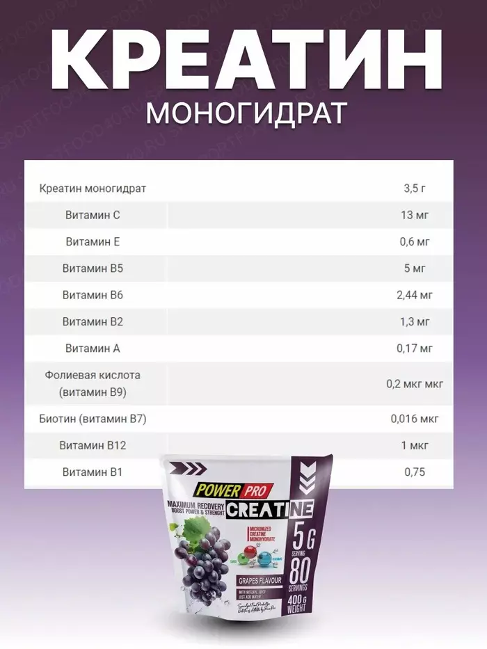 PowerPro Креатин Maximum Recovery Виноград, 400 г — это инновационная добавка, созданная для максимального восстановления и повышения спортивных результатов. Этот продукт идеально подходит для атлетов и любителей фитнеса, стремящихся улучшить свои показатели и ускорить процесс восстановления после интенсивных тренировок.Преимущества и свойства:Ускоренное восстановление:Креатин способствует быстрому восстановлению мышц после физических нагрузок, уменьшая усталость и повышая выносливость.Увеличение силы и мощности:Регулярное употребление креатина способствует увеличению мышечной силы и мощности, что позволяет достигать новых высот в тренировках.Поддержка гидратации:Формула с добавлением электролитов помогает поддерживать оптимальный уровень гидратации, что особенно важно во время интенсивных тренировок.Вкусный и освежающий:Приятный виноградный вкус делает прием добавки не только полезным, но и приятным.Удобство использования:Порошковая форма легко растворяется в воде, обеспечивая быстрое и удобное употребление.Особенности:PowerPro Креатин Maximum Recovery отличается высокой чистотой и качеством ингредиентов. Продукт разработан с учетом потребностей спортсменов и активных людей, стремящихся к максимальной эффективности своих тренировок. Благодаря оптимальной дозировке и сбалансированной формуле, креатин легко усваивается организмом, обеспечивая быстрый эффект.Условия хранения:Храните продукт в сухом, прохладном месте, защищенном от прямых солнечных лучей. После вскрытия упаковки рекомендуется плотно закрывать крышку, чтобы избежать попадания влаги и сохранить свежесть продукта.О бренде PowerPro:PowerPro это бренд, предлагающий продукцию для поддержания здоровья и укрепления иммунной системы. С использованием натуральных ингредиентов и строгого контроля качества, PowerPro создает продукты, которые помогают людям поддерживать баланс здоровья и достигать своих жизненных целей. Более 15 лет PowerPro помогает людям по всему миру поддерживать здоровье и активность.