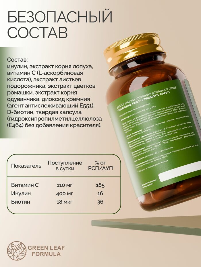 Пребиотик комплекс на основе инулина и лекарственных растений для пищеварения и работы кишечника, с добавлением витамина С и D- биотина для усиления иммунитета. БАД разработан для мягкой поддержки пищеварительной системы, нормализации веса, помогает восстановить баланс кишечной микрофлоры, улучшить работу ЖКТ, улучшить перистальтику кишечника и поддержать метаболизм.Натуральные растительные экстракты подорожника, ромашки, лопуха и одуванчика уменьшают внутренние воспаления, помогают при язве желудка, гастрите, энтероколите и язве кишечника, помогают избавиться от шлаков и токсинов, активизируют функции печени и поджелудочной железы.Инулин, витамин С и D-биотин в сочетании полезны для поддержания здоровья и улучшения работы всех функций организма, для укрепления иммунитета. Активные компоненты:Инулин - натуральный пребиотик, улучшает пищеварение и перистальтику, уменьшает вздутие, способствует контролю аппетита и веса, мягко регулирует уровень сахара.Экстракт корня лопуха - очищает организм и поддерживает работу печени, ускоряет обмен веществ, помогает улучшить состояние кожи.Витамин C (L-аскорбиновая кислота) - поддерживает иммунитет, участвует в обменных процессах, оказывает антиоксидантное действие.Экстракт листьев подорожника  - успокаивает слизистую ЖКТ, улучшает перистальтику, снижает воспаление и способствует мягкому очищению.Экстракт цветков ромашки - уменьшает газообразование и спазмы, поддерживает комфортное пищеварение, способствует нормальной работе желудка и кишечника.Экстракт корня одуванчика - стимулирует пищеварение и выработку желчи,поддерживает липидный обмен и контроль веса, благоприятно влияет на работу печени.D-биотин (витамин H) - участвует в обмене углеводов, белков и жиров, поддерживает энергию и метаболизм, способствует здоровью кожи, волос и ногтей.Противопоказания: индивидуальная непереносимость компонентов БАД, беременность, кормлениегрудью. Перед применением необходимо проконсультироваться с врачом.