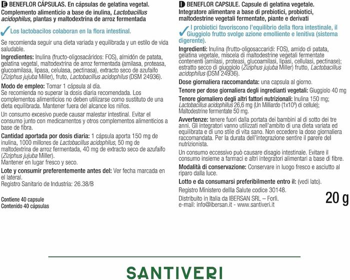 Капсулы легко проглатываются и подходят для ежедневного использования. Пребиотик Santiveri Beneflor рекомендуется для людей, стремящихся поддерживать здоровье кишечника и улучшить пищеварение.