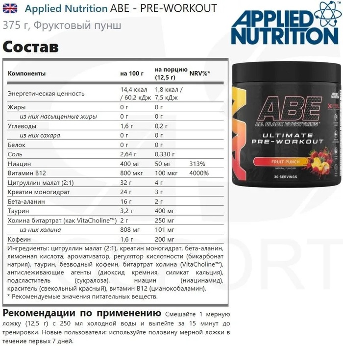Applied Nutrition Предтренировочный комплекс ABE Фруктовый пунш, 375 г — это мощный предтренировочный комплекс, созданный для максимальной поддержки вашей тренировки. Он сочетает в себе тщательно подобранные ингредиенты, которые помогают повысить выносливость, концентрацию и общую производительность, обеспечивая вас энергией на весь тренировочный процесс.