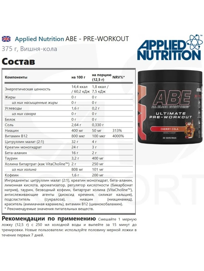 Applied Nutrition Предтренировочный комплекс ABE Вишня кола, 375 г — это мощный предтренировочный продукт, созданный для максимальной поддержки вашей тренировки. Он сочетает в себе тщательно подобранные ингредиенты, которые помогают повысить выносливость, концентрацию и общую производительность во время физических нагрузок.