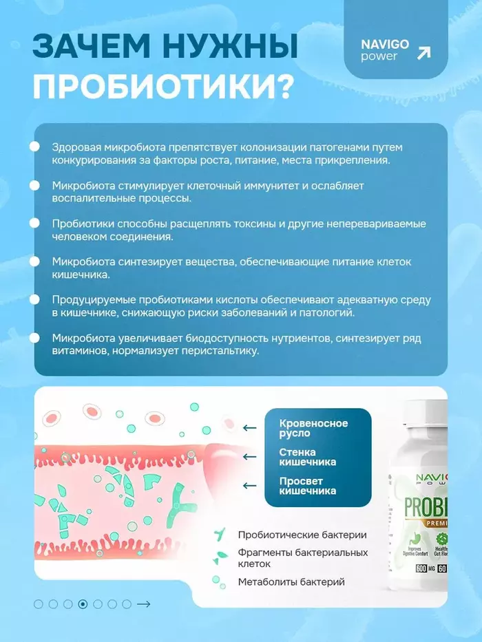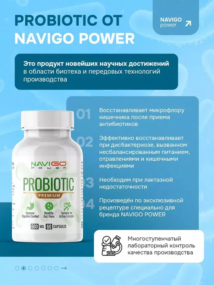 Пробиотик для кишечника от NAVIGO POWER — это эффективный БАД для поддержания здоровья пищеварительной системы. В каждой упаковке содержится 60 капсул, которые помогут улучшить работу кишечника и восстановить микрофлору.