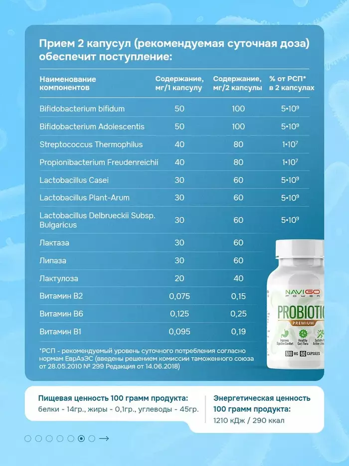 Капсулы легко проглатываются и подходят для ежедневного использования. Пробиотик от NAVIGO POWER рекомендуется принимать в периоды стресса, после антибиотикотерапии или при нарушениях в питании.