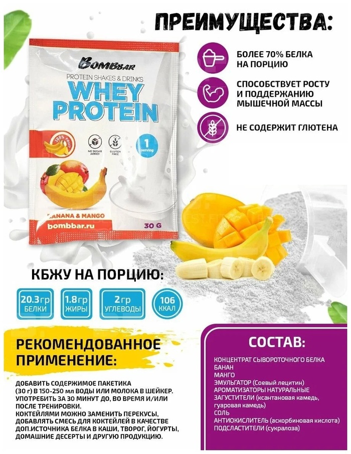Протеиновый коктейль Банан-манго от бренда Bombbar — это отличный способ поддержать свой рацион и обеспечить организм необходимыми белками. В каждой порции (30 гр.) вы получите вкусный и питательный коктейль, который идеально подходит для активных людей.