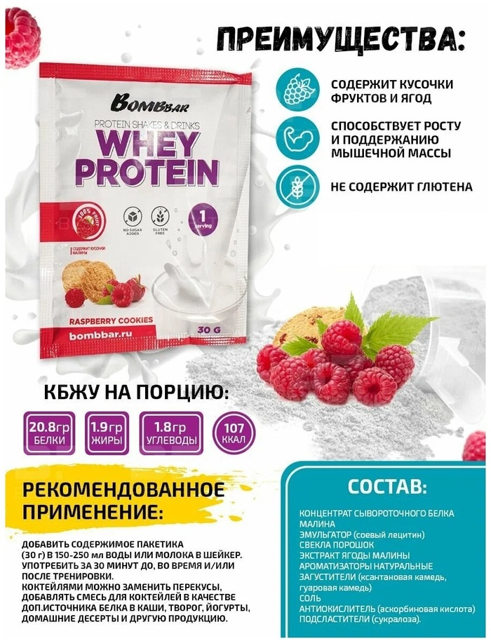 Протеиновый коктейль (порционный) Малиновое печенье от бренда Bombbar — это отличный способ поддержать свой рацион белком. В каждой порции (30 гр.) содержится высококачественный протеин, который поможет вам восстановиться после тренировок и поддерживать мышечную массу.