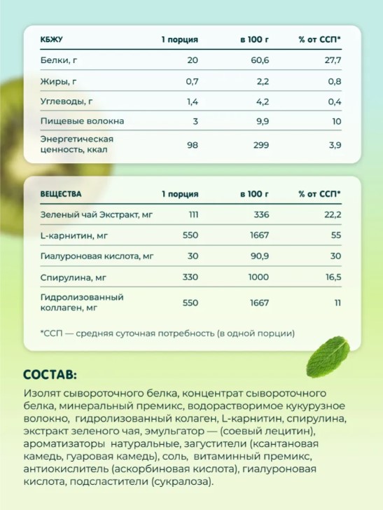 • Удобство использования: Легко растворяется в воде или молоке, что позволяет быстро приготовить коктейль в любое время.
