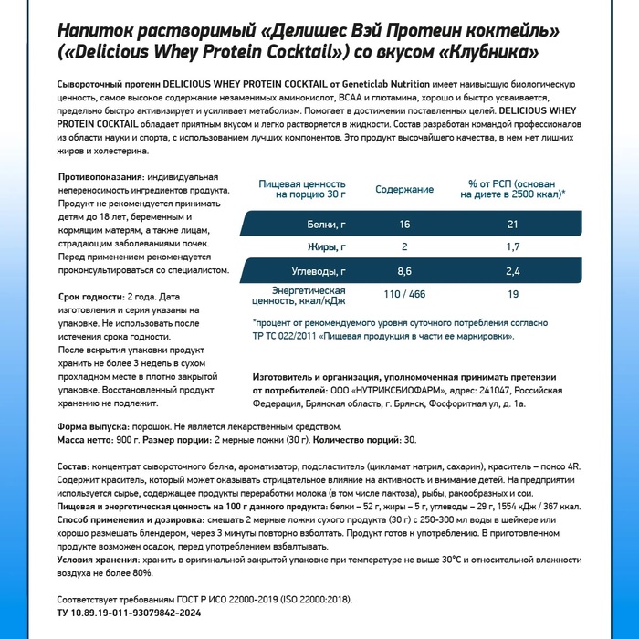 Geneticlab Сывороточный протеин DELICIOUS Whey Клубника, 900 г