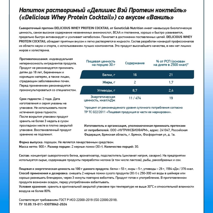 Geneticlab Сывороточный протеин DELICIOUS Whey Ваниль, 900 г