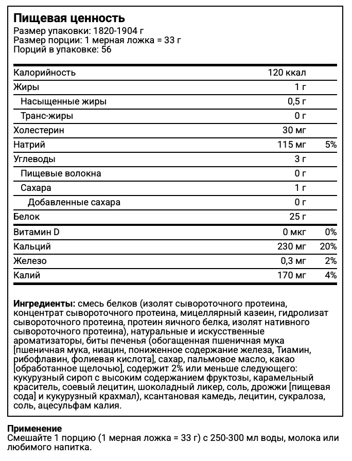 Для приготовления 1-й порции смешать 1 мерную ложку протеина (33 г) с 240-300 мл воды, молока или другого любимого напитка. Принимать по 1-й порции после тренировочных сессий для быстрого восстановления, между приемами пищи, перед сном.