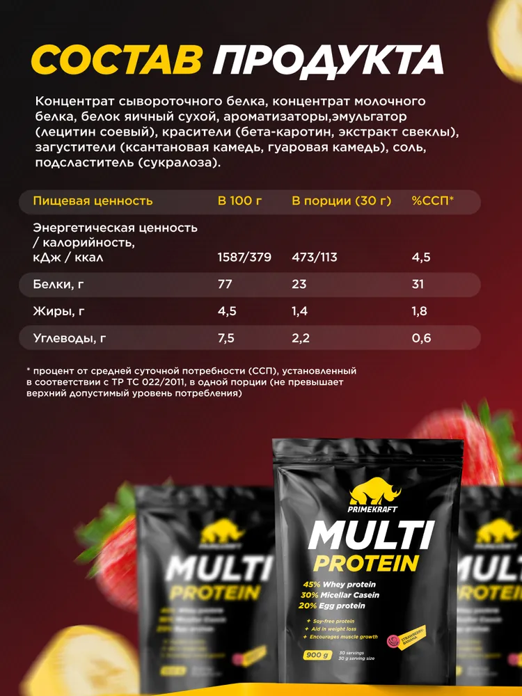 Prime Kraft Протеин MULTI PROTEIN Клубника-банан, 900 г — это высококачественный протеиновый коктейль, который сочетает в себе несколько видов белка для обеспечения комплексного аминокислотного профиля. Этот продукт идеально подходит для спортсменов и активных людей, стремящихся поддерживать или наращивать мышечную массу.