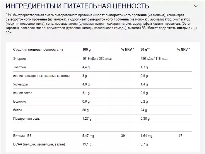 • Высокое содержание белка: Каждый порция содержит 100% чистого сывороточного белка, что способствует росту и восстановлению мышечной массы.