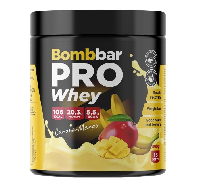 Bombbar Протеин сывороточный PRO Банан-манго, 450 г — это высококачественный источник белка, специально разработанный для поддержки мышечного роста, восстановления и улучшения физической формы. Этот продукт идеально подходит для спортсменов, фитнес-энтузиастов и всех, кто стремится к здоровому образу жизни.