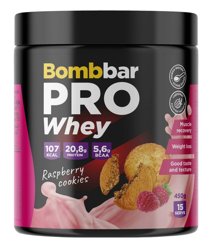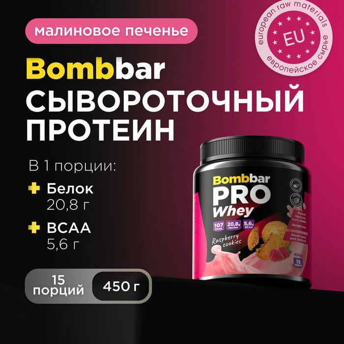 Bombbar Протеин сывороточный PRO Малиновое печенье, 450 г — это высококачественный источник белка, специально разработанный для поддержки мышечного роста, восстановления и улучшения физической формы. Этот продукт идеально подходит для спортсменов, фитнес-энтузиастов и всех, кто стремится к здоровому образу жизни.