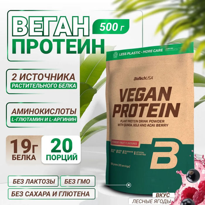 Протеин веганский Лесные ягоды от BioTech — это отличный выбор для тех, кто ищет растительный источник белка. В каждой упаковке содержится 500 г высококачественного протеина, который идеально подходит для веганов и вегетарианцев.