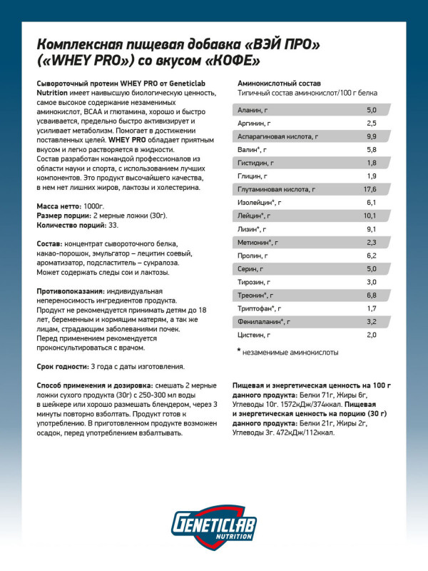Geneticlab Сывороточный протеин Whey PRO Кофе Капучино, 1000 г