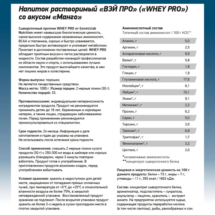 Сывороточный протеин Whey PRO Манго от бренда Geneticlab — это идеальный выбор для тех, кто стремится к эффективному похудению и поддержанию мышечной массы. В каждой упаковке содержится 1000 г высококачественного протеинового коктейля без сахара, который легко усваивается и обладает приятным вкусом манго.