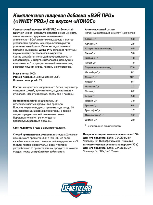 Geneticlab Сывороточный протеин Whey PRO Кокос, 1000 г