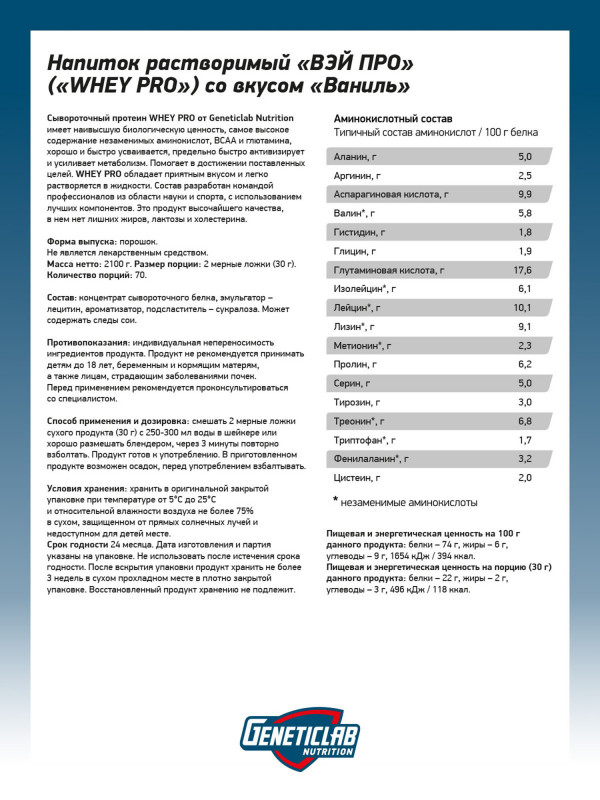 Протеиновый белковый коктейль без сахара Whey Pro Ваниль мороженое от бренда Geneticlab — это отличный выбор для тех, кто стремится к похудению и поддержанию мышечной массы. В каждой упаковке содержится 1000 г высококачественного сывороточного протеина, который поможет вам достичь ваших фитнес-целей.
