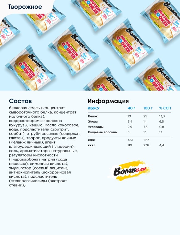 Протеиновое печенье Bombbar Творожное — это здоровый и вкусный вариант перекуса, особенно подходящий для тех, кто следит за своим питанием. Одно печенье весом 40 грамм содержит значительное количество белка, что делает его идеальным выбором для спортсменов, диабетиков, беременных и кормящих женщин, а также для тех, кто соблюдает диету.