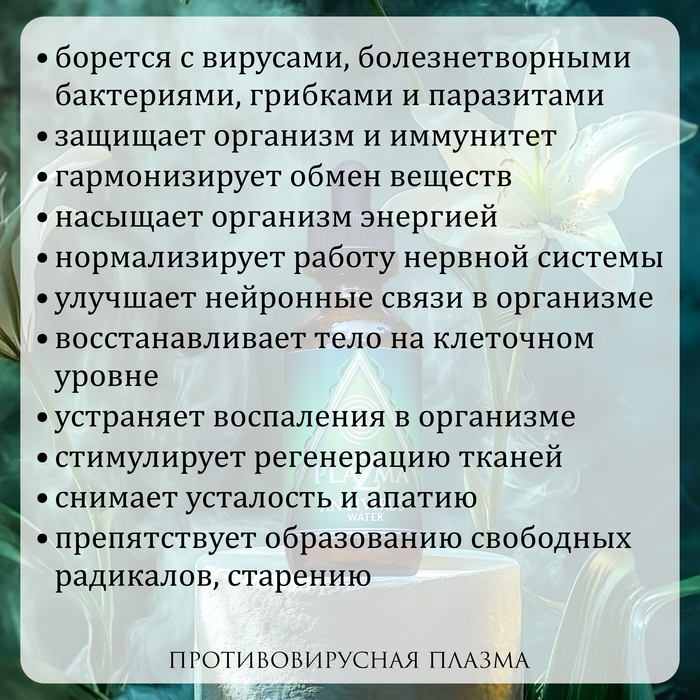 Противовирусная плазма Antivirus Water — это инновационный продукт от бренда Plazmawater, который обеспечивает клеточное питание с биодоступностью 99,9%. Объем упаковки составляет 50 мл, что делает его удобным для использования в повседневной жизни.