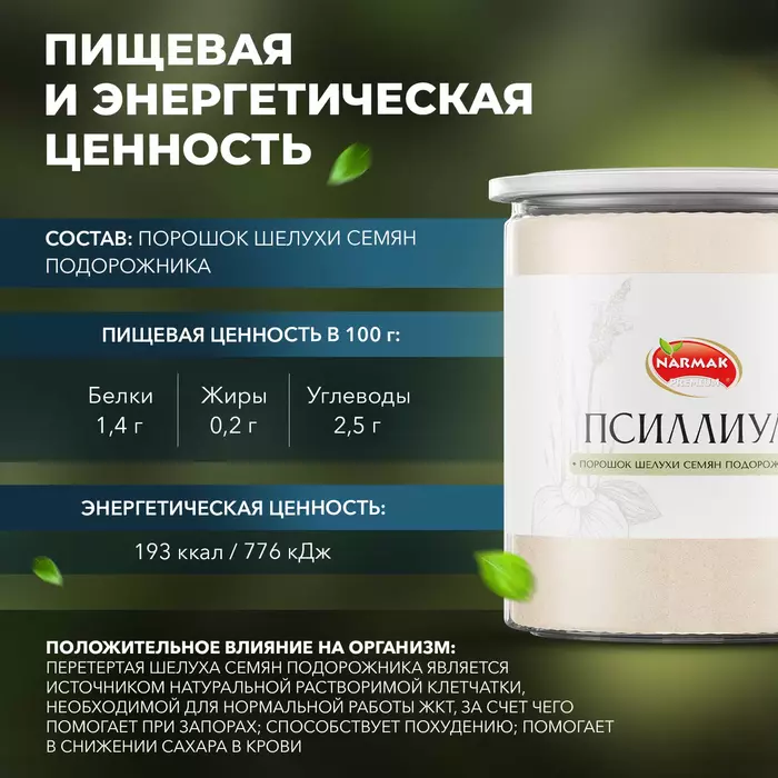 • Натуральный источник клетчатки: Псиллиум является отличным источником растворимой клетчатки, что способствует улучшению обмена веществ.