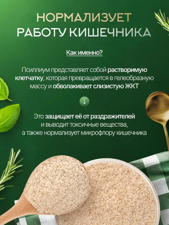 • Поддержка пищеварения: Псиллиум помогает улучшить работу кишечника и способствует регулярному стулу.