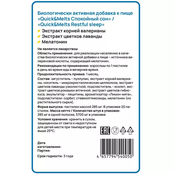 Форма таблетки Quick&Melts разработана для удобного и быстрого применения: они растворяются во рту, обеспечивая быстрое усвоение активных веществ. Продукт помогает не только улучшить качество ночного отдыха, но и снизить уровень тревожности, стресса и нервного перенапряжения. Это оптимальное решение для людей, которые хотят восстановить нормальный цикл сна и избавиться от бессонницы без применения сильных химических препаратов.