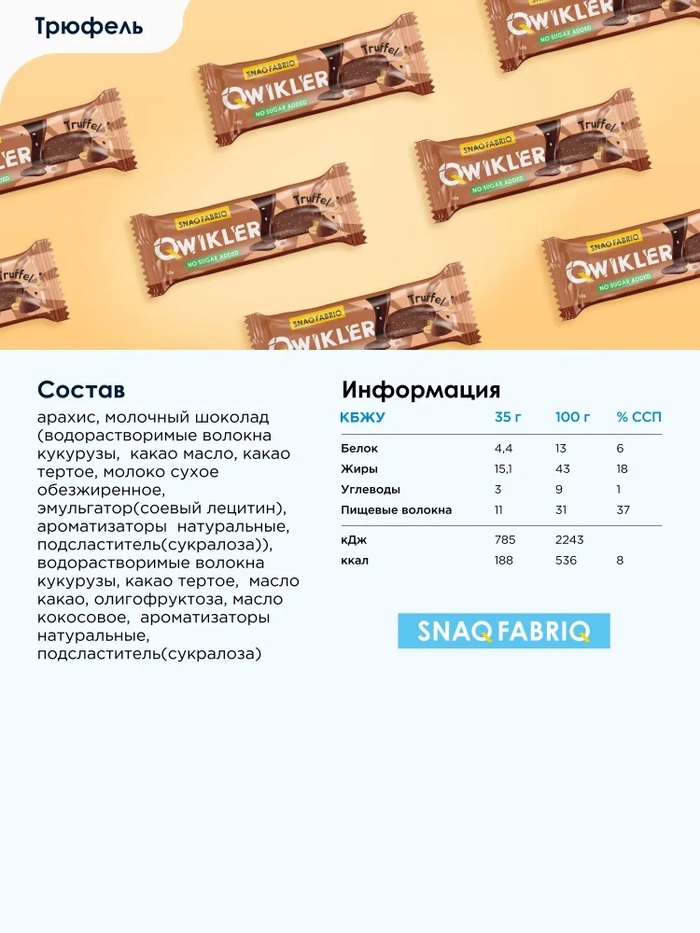 Bombbar Батончик глазированный SNAQ FABRIQ Qwikler, Трюфель — это нежный и роскошный десерт, который сделает ваше питание еще более вкусным и здоровым.