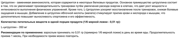 R-LINE Аминокислота L-Цитруллин, 200 г — это высококачественная добавка, разработанная для поддержки физической активности, улучшения кровообращения и повышения выносливости. Идеально подходит для спортсменов и активных людей, стремящихся улучшить свои результаты и ускорить восстановление после тренировок.Преимущества и свойства:Улучшение кровообращения:L-Цитруллин способствует расширению кровеносных сосудов, улучшая кровоток и доставку кислорода к мышцам.Повышение выносливости:Увеличивает уровень энергии и снижает усталость, позволяя тренироваться дольше и интенсивнее.Ускорение восстановления:Способствует быстрому восстановлению мышц после физических нагрузок, уменьшая мышечную боль и усталость.Поддержка азотистого баланса:Увеличивает уровень оксида азота в организме, что способствует улучшению мышечной массы и силы.Антиоксидантная защита:Обладает антиоксидантными свойствами, защищая клетки от повреждений и поддерживая общее здоровье организма.Особенности:Аминокислота L-Цитруллин от R-LINE отличается высокой чистотой и эффективностью. Продукт не содержит искусственных добавок и консервантов, что делает его безопасным для ежедневного использования. Идеально подходит для всех уровней физической подготовки, от начинающих до профессиональных спортсменов.Условия хранения:Храните продукт в сухом, прохладном месте, защищенном от прямых солнечных лучей и влаги. Держите в недоступном для детей месте. После вскрытия упаковки рекомендуется использовать продукт в течение 6 месяцев для сохранения его свойств и эффективности.О бренде R-LINE:R-LINE это бренд, предлагающий продукцию для поддержания здоровья и укрепления иммунной системы. С использованием натуральных ингредиентов и строгого контроля качества, R-LINE создает продукты, которые помогают людям поддерживать баланс здоровья и достигать своих жизненных целей. Более 10 лет R-LINE помогает людям по всему миру поддерживать здоровье и активность.