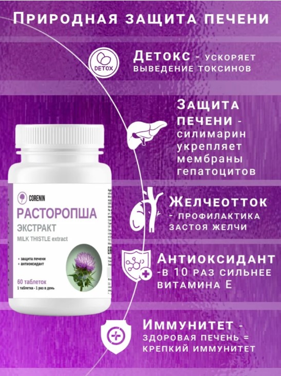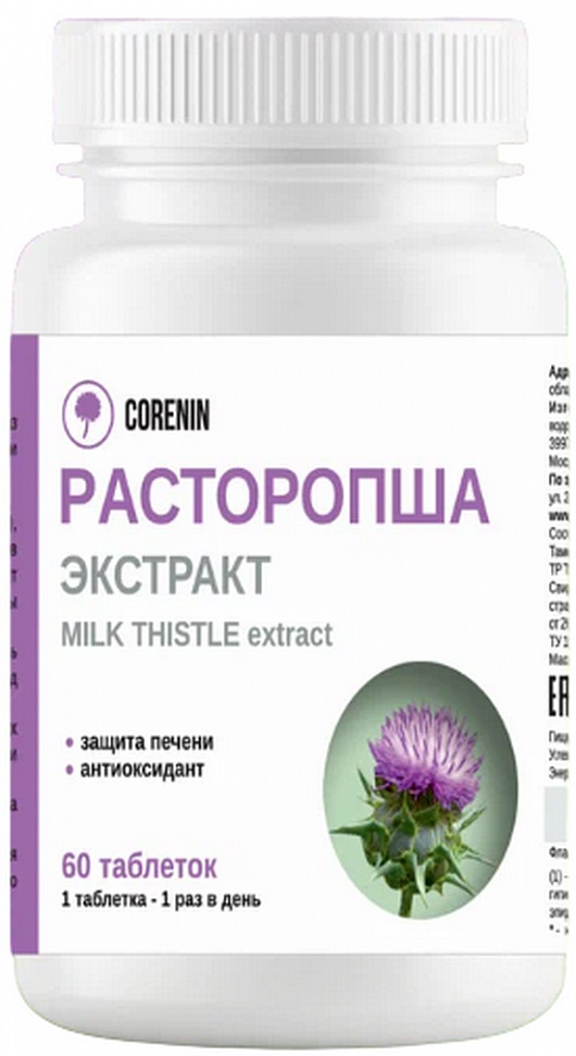 Расторопша (500 мг) от бренда Corenin — это натуральный продукт, который поддерживает здоровье печени и способствует ее восстановлению. В каждой упаковке содержится 60 таблеток, что обеспечивает длительный курс применения.