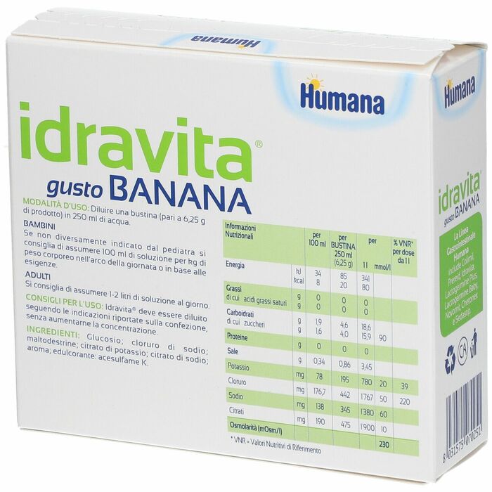 Раствор для регидратации Idravita Humana со вкусом банана — это эффективное средство для восстановления водно-электролитного баланса в организме. Он идеально подходит для людей, страдающих от обезвоживания, и содержит все необходимые электролиты.