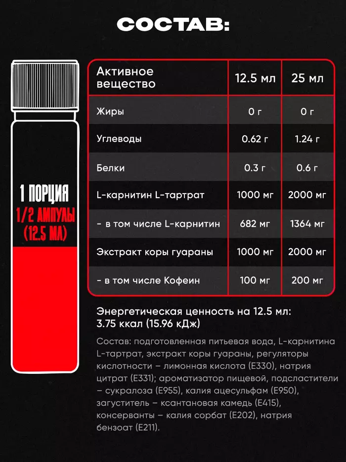 Выпить 1 ампулу (25 мл) за 15-20 минут до тренировки. Не превышать 1 ампулу в день.