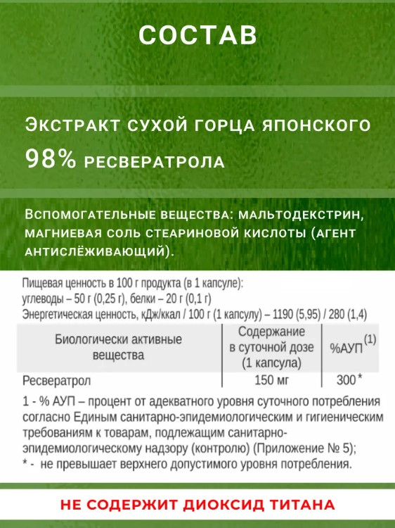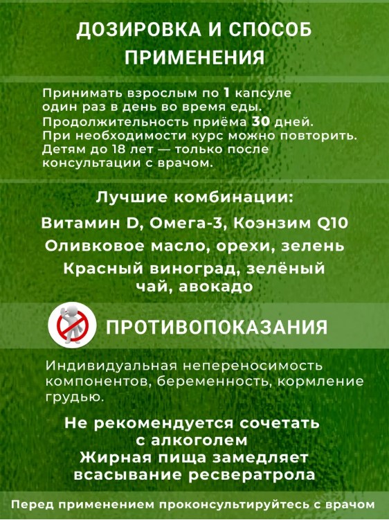 Капсулы Ресвератрол легко проглатываются и подходят для ежедневного использования. Рекомендуется принимать в рамках сбалансированного питания и активного образа жизни.