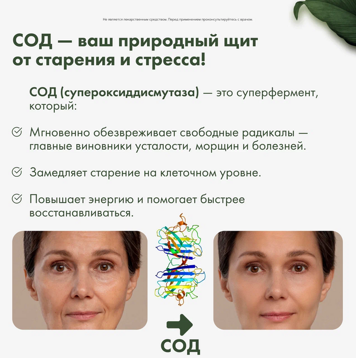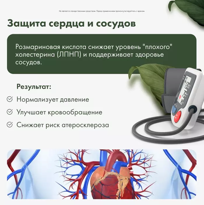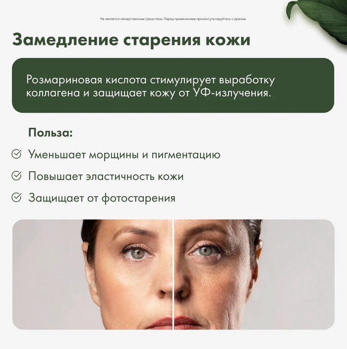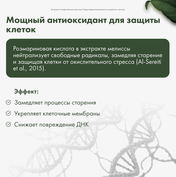 • Антиоксидантная защита: Розмариновая кислота и супероксиддисмутаза (СОД) помогают нейтрализовать свободные радикалы, защищая клетки от окислительного стресса.