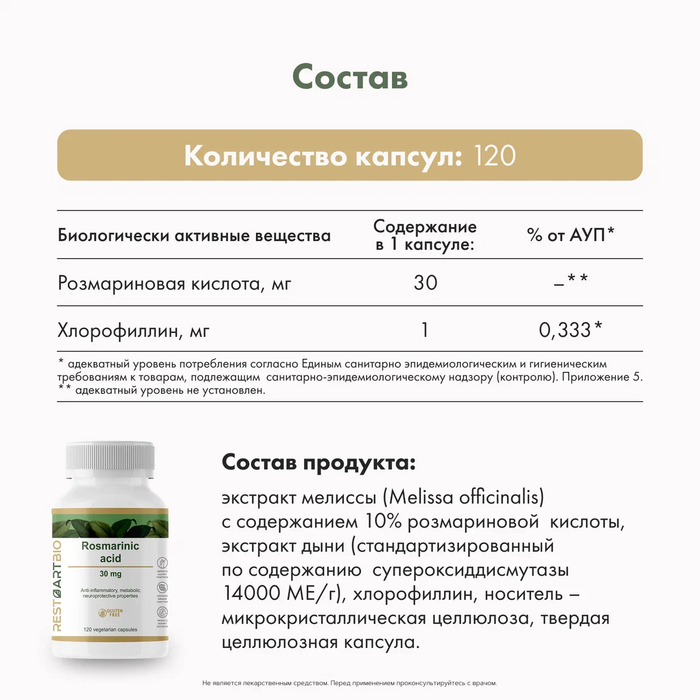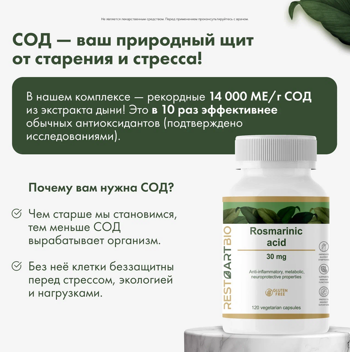 Розмариновая кислота, супероксиддисмутаза (СОД) и хлорофиллин от бренда RestartBio — это мощный комплекс, который поддерживает здоровье и активность организма. В каждой упаковке содержится 120 капсул, каждая из которых содержит 30 мг активных ингредиентов.