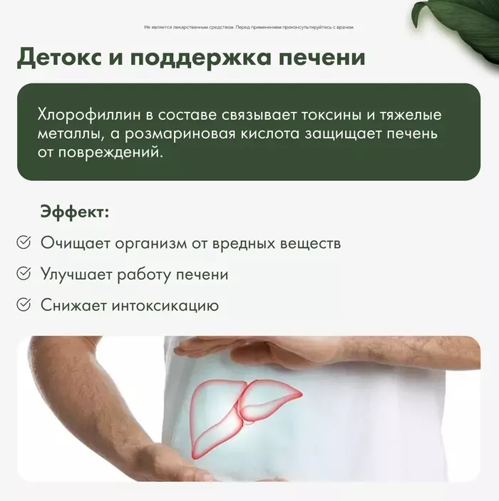 • Улучшение обмена веществ: Хлорофиллин способствует улучшению обмена веществ и детоксикации организма.