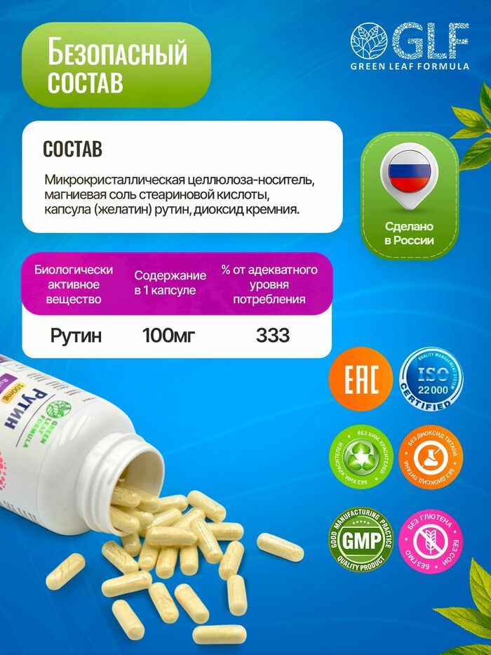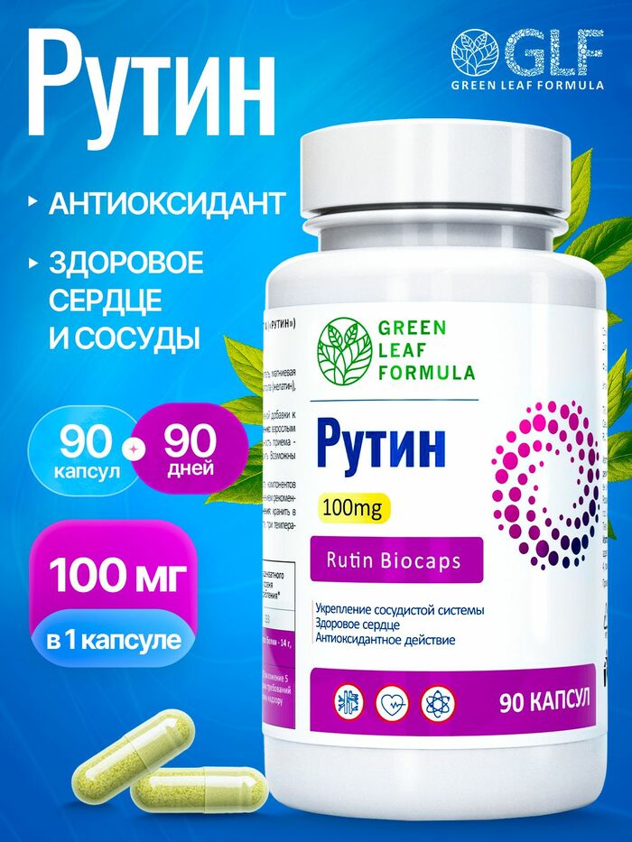 Рутин (100 мг) от бренда GREEN LEAF FORMULA — это высококачественная добавка, которая поддерживает здоровье сосудов и улучшает циркуляцию крови. В каждой упаковке содержится 90 капсул, что обеспечивает длительный курс приема.