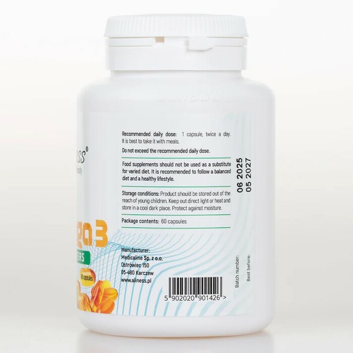 Рыбий жир Aliness Omega 3 Forte Ester 500/250 мг — это высококачественный источник омега-3 жирных кислот, который поддерживает здоровье сердечно-сосудистой системы и улучшает общее состояние организма. В каждой упаковке содержится 60 капсул, что обеспечивает длительный курс приема.