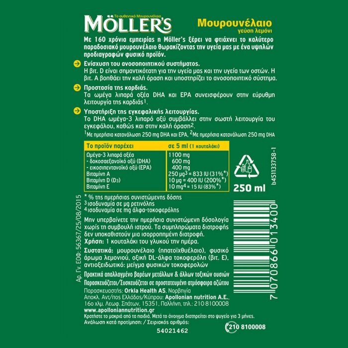 Рыбий жир Moller's Cod Liver Oil со вкусом лимона — это высококачественный продукт, который обеспечивает организм необходимыми омега-3 жирными кислотами и витаминами. Упаковка содержит 250 мл масла, которое идеально подходит для всей семьи.