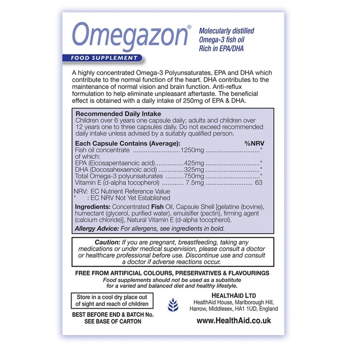 Рыбий жир Omegazon 1250 мг с ЭПК и ДГК от бренда Health Aid — это высококачественная добавка, которая поддерживает здоровье сердечно-сосудистой системы и способствует нормализации уровня холестерина. В каждой упаковке содержится 60 капсул, что обеспечивает длительный курс приема.