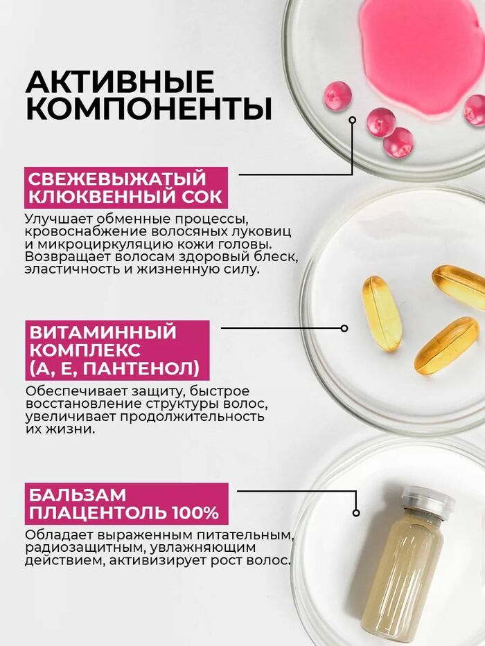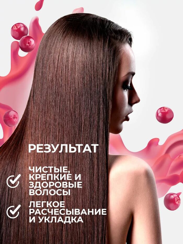 • Активность клюквенного сока: клюквенный сок помогает оживить волосы и усилить ухаживающий эффект.