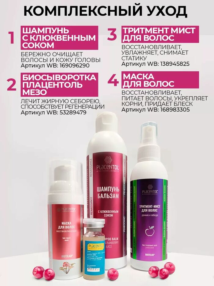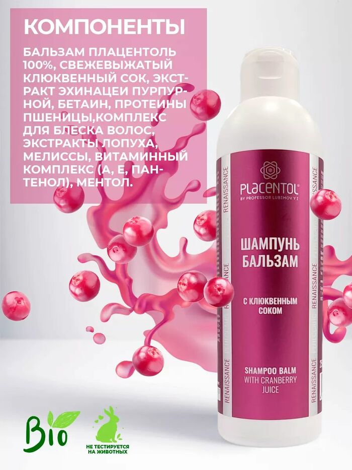 Шампунь-бальзам с клюквенным соком от «Плацентоль» подходит для ежедневного использования и ежедневного ухода. Очищает, укрепляет и питает, помогая поддерживать волосы в хорошем состоянии.