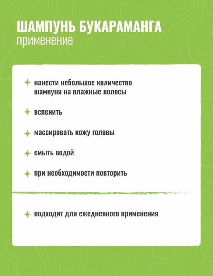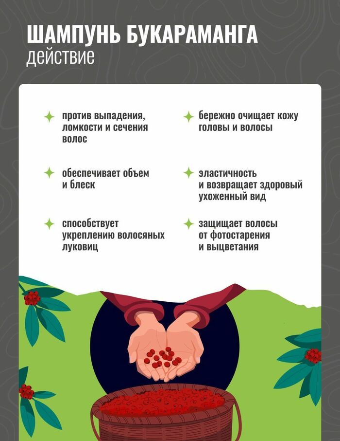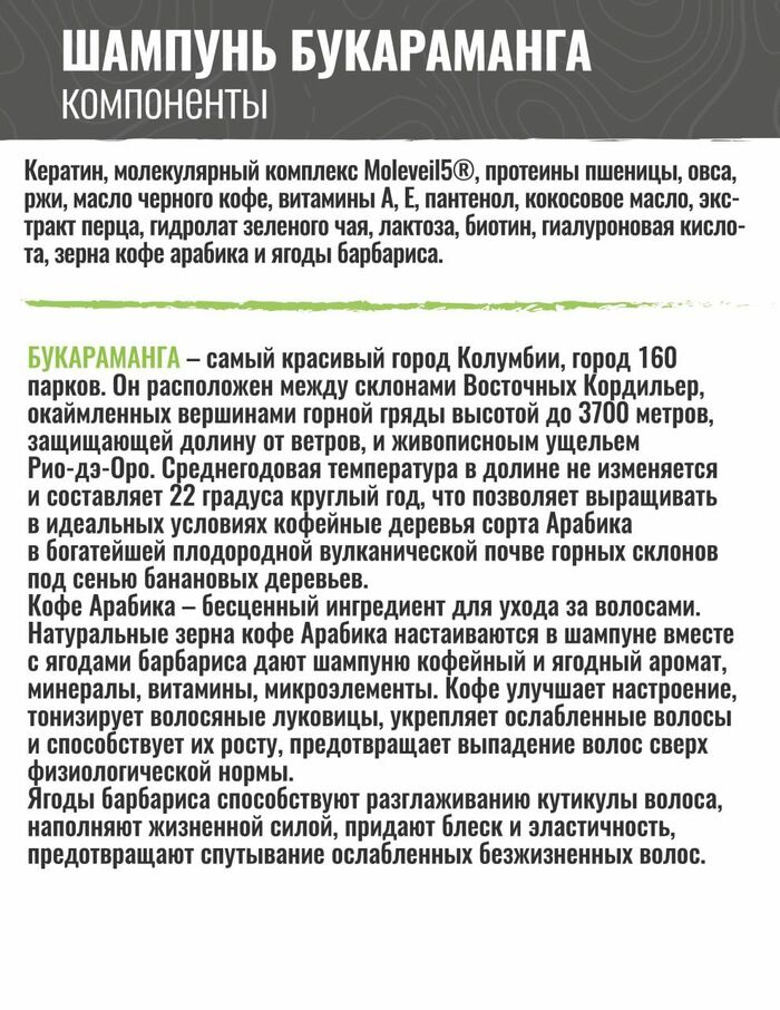 «Букараманга»- восстанавливающий молекулярный тритмент-шампунь против выпадения, ломкости и сечения волос.Бережно очищает кожу головы и волосы, обеспечивает объем, блеск, эластичность и возвращает здоровый ухоженный вид. При регулярном применениивосстанавливает поврежденную структуру стержня по всей длине, способствует укреплению волосяных луковиц на глубоком молекулярном уровне. Останавливает потерю волос, предотвращает ломкость и сечение, защищает волосы от фотостарения и выцветания.Средство прошло клинические испытания.Если во время эксплуатации у Вас возникли вопросы,мы ответим на них. Шампунь Букараманга -отличный выбор для Ваших волос!