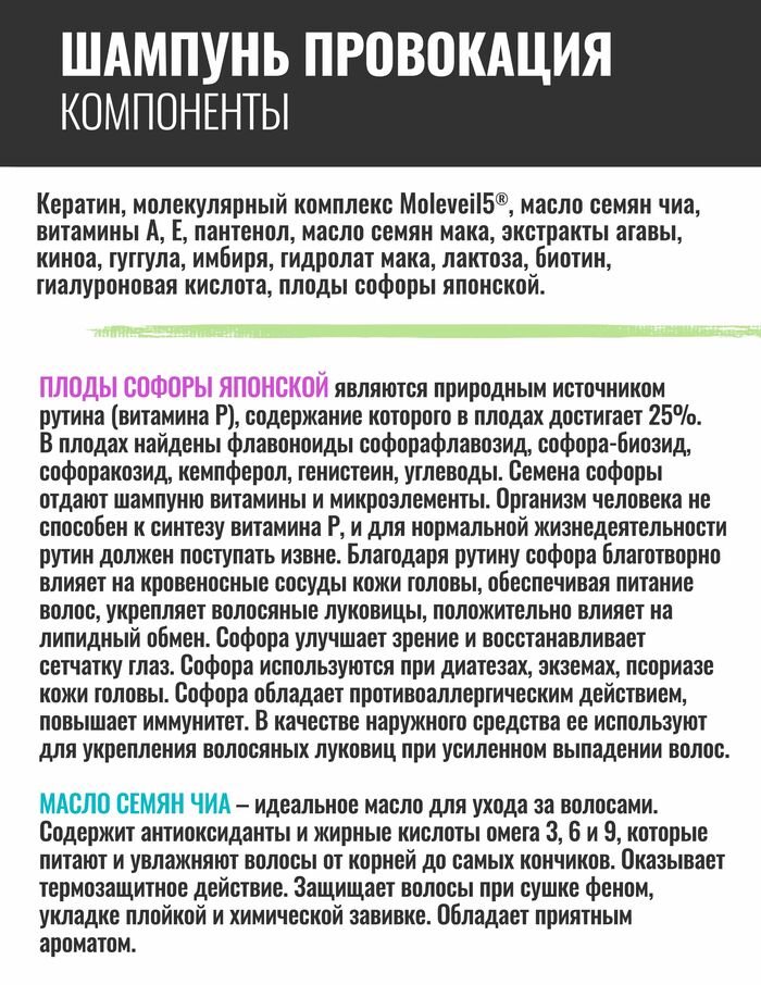 «Провокация» с софорой-стимулирующий укрепляющий молекулярный шампунь, драйв-уход с ярким ароматом для энергичных женщин.Эффективно очищает кожу головы и волосы. Обеспечивает объем, блеск, силу волосам, экстра-тонус и интенсив-питание для кожи головы. При регулярном применении стимулирует рост волос, способствует укреплению волосяных луковиц на глубоком молекулярном уровне.Шампунь мягко очищает кожу головы, увлажняет, питает локоны, делает их эластичными. Состав обволакивает каждый волос, защищает его от вредного воздействия среды,его формула направлена на восстановление утраченных волосЛоконы после использования гладкие и блестящие, меньше жирнятся.Шампунь, содержащий, комплекс витаминов А,Е, а также другие натуральные компоненты, способствующие усилению кровообращения и роста. Длительное использование такого продукта будет способствовать росту здоровых и крепких волос. Рекомендуем попробовать в сочетании с кондиционером из этой же серии.Средство прошло клинические испытания.Если во время эксплуатации у Вас возникли вопросы,мы ответим на них. Шампунь «Провокация» с софорой-отличный выбор для Ваших волос!
